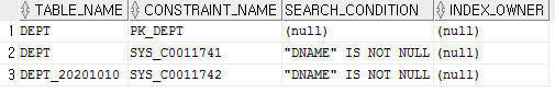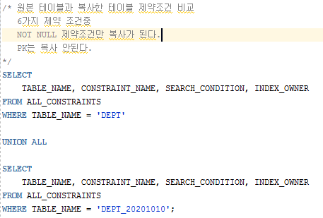 복사한 DEPT_20201010 테이블은 NOT NULL 제약조건만 복사되었다.